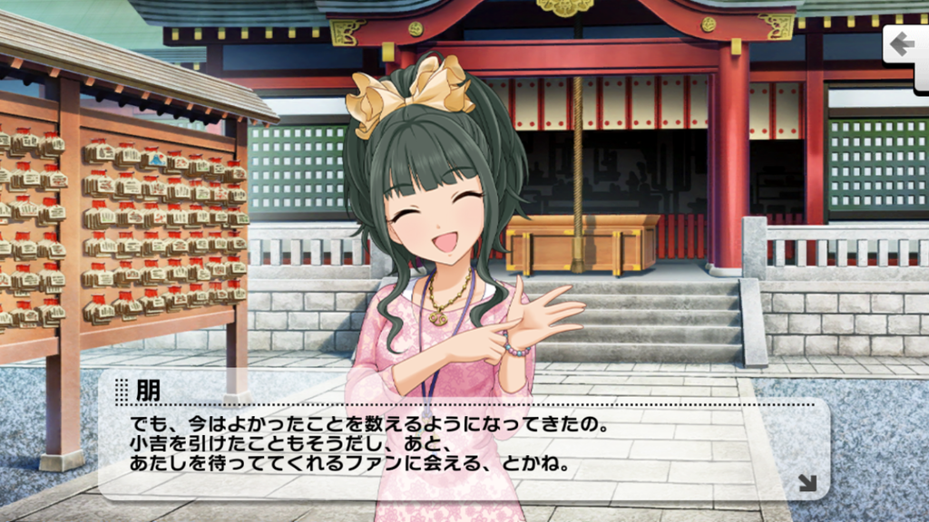 ちなみにモバマスだと『これまでずっと吉しか引けなかった』とのセリフがあります。実は卯月よりも吉しか引けなかった時間が長いんです。デレステでは『最近』とセリフが変わっているため、こちらでは吉だけしか引いたことがないわけではないのでしょう。