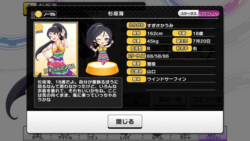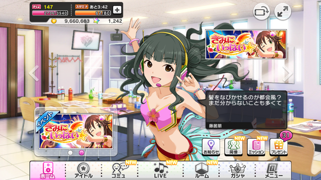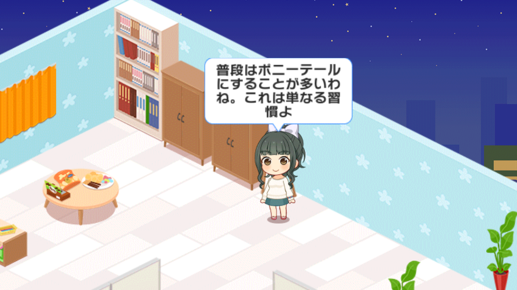 『ポニーテールが習慣になっている』とはデレステで初めて出た情報です。いろいろな髪型を見せることで有名だとは思いますが、確かにデレステだと3/4とポニーテールの比重が高いですね、モデルもポニーテールですし。でもツインテールで踊る朋ちゃんも見たい。