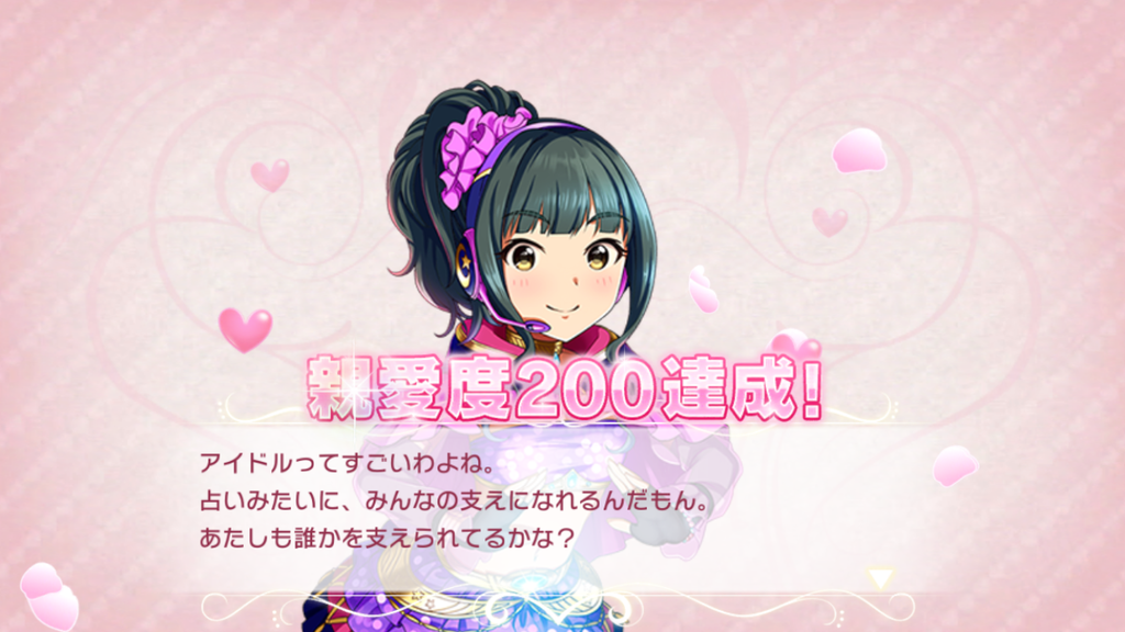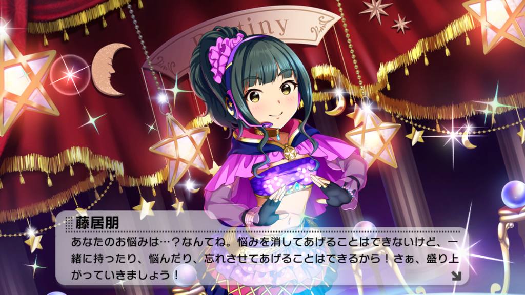 『占いみたいにみんなの支えになれている』というのが朋ちゃんのアイドル感であり、特訓時セリフの『悩みを消すことはできないけど、一緒に持ったり、悩んだり、忘れさせてあげることはできる』とはきっと朋ちゃん自身が占いから支えられてきた部分なのでしょう。そして、自分もまたそうなりたいと考えています。