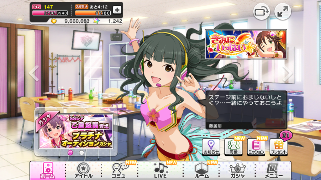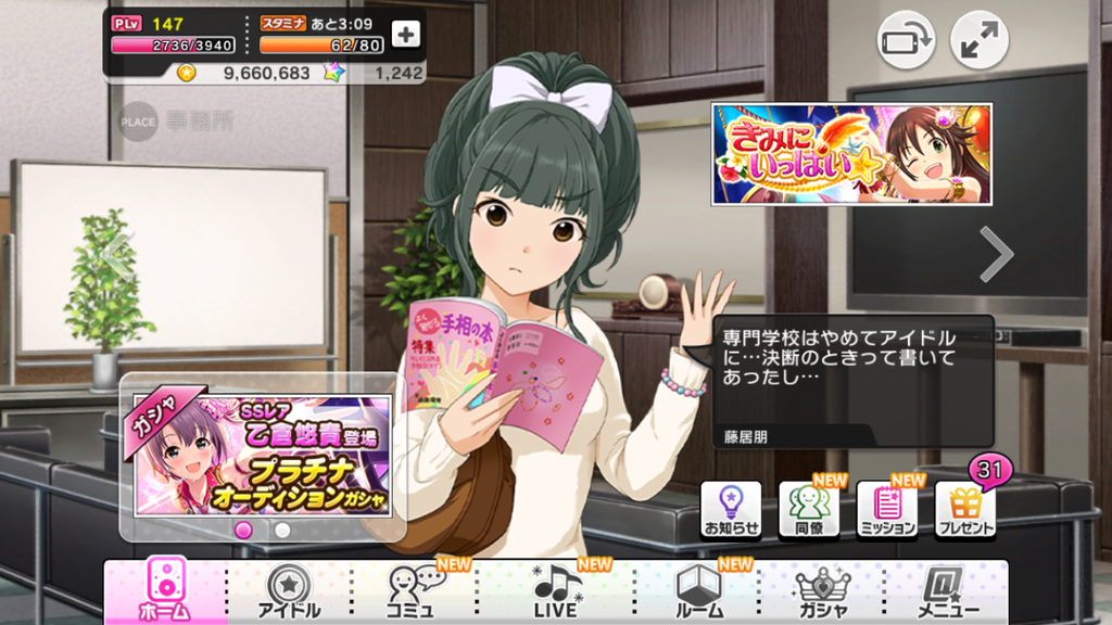 ちなみに、デレステコミュの立ち絵は元々モバマスで『[ラッキーフォーチュン]藤居朋』として登場しました。同カードは朋ちゃんと手相に重点を置いたカードとなっており『運命線がこっちだから……こら、くすぐらないの○○』『あたしのアイドルとしての生命線は……○○じゃない? ね♪』などのセリフがあります、かわいい。