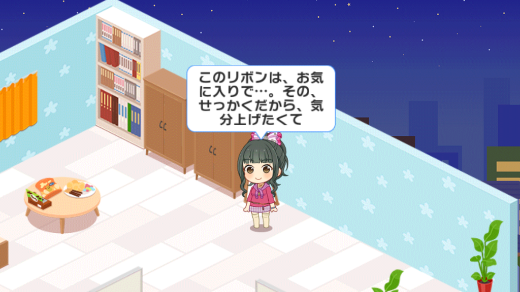ちなみに、モバマス含め朋ちゃんは同じリボンを一切使っていません。私服で使っているリボンはすべてメインとなる色が違ったものとなっており、単色のものが多いです。おそらくラッキーカラーで何色が出ても身につけられるように、さまざまな色のリボンが家にあることでしょう。